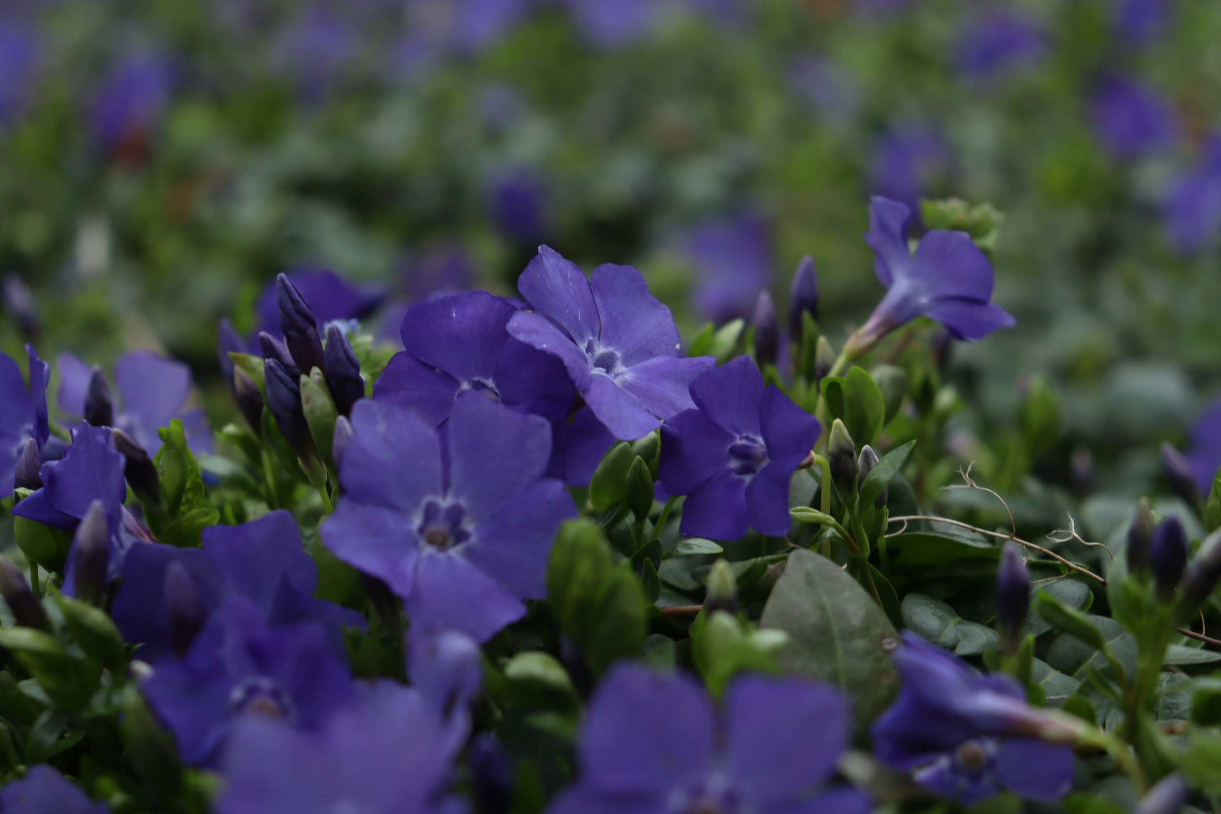 - Kännetecken: En krypande marktäckare med blanka, mörkgröna blad och trattformade blåvioletta blommor.